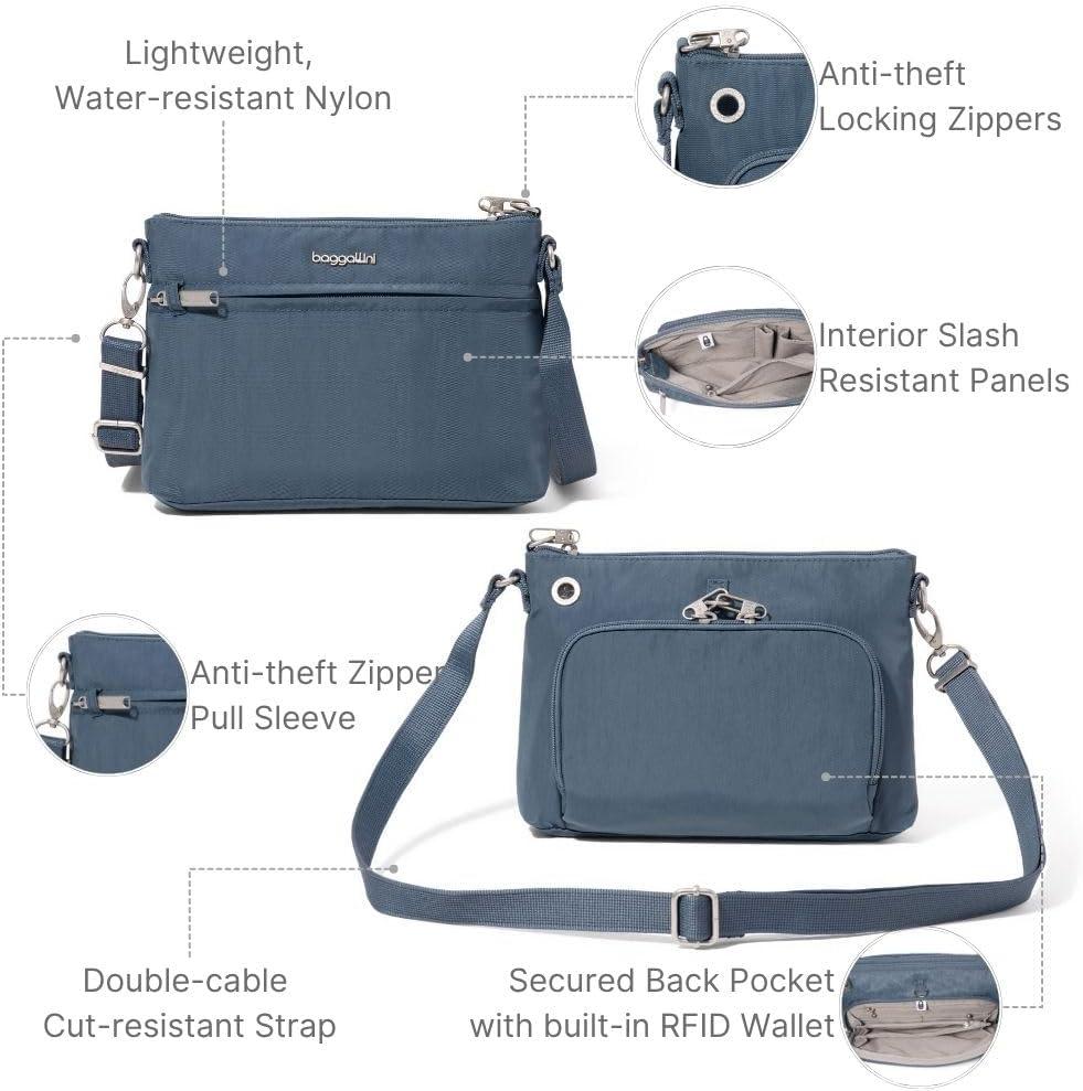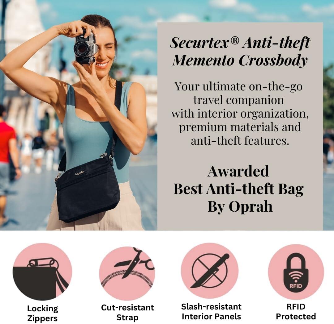 Enjoy your next trip worry-free with an anti-theft crossbody bag. The Securtex® anti-theft memento crossbody bag features slash resistant panels, a double-cable cut-resistant strap, locking zippers, and RFID-protection. It protects your things, so you can focus on the journey.