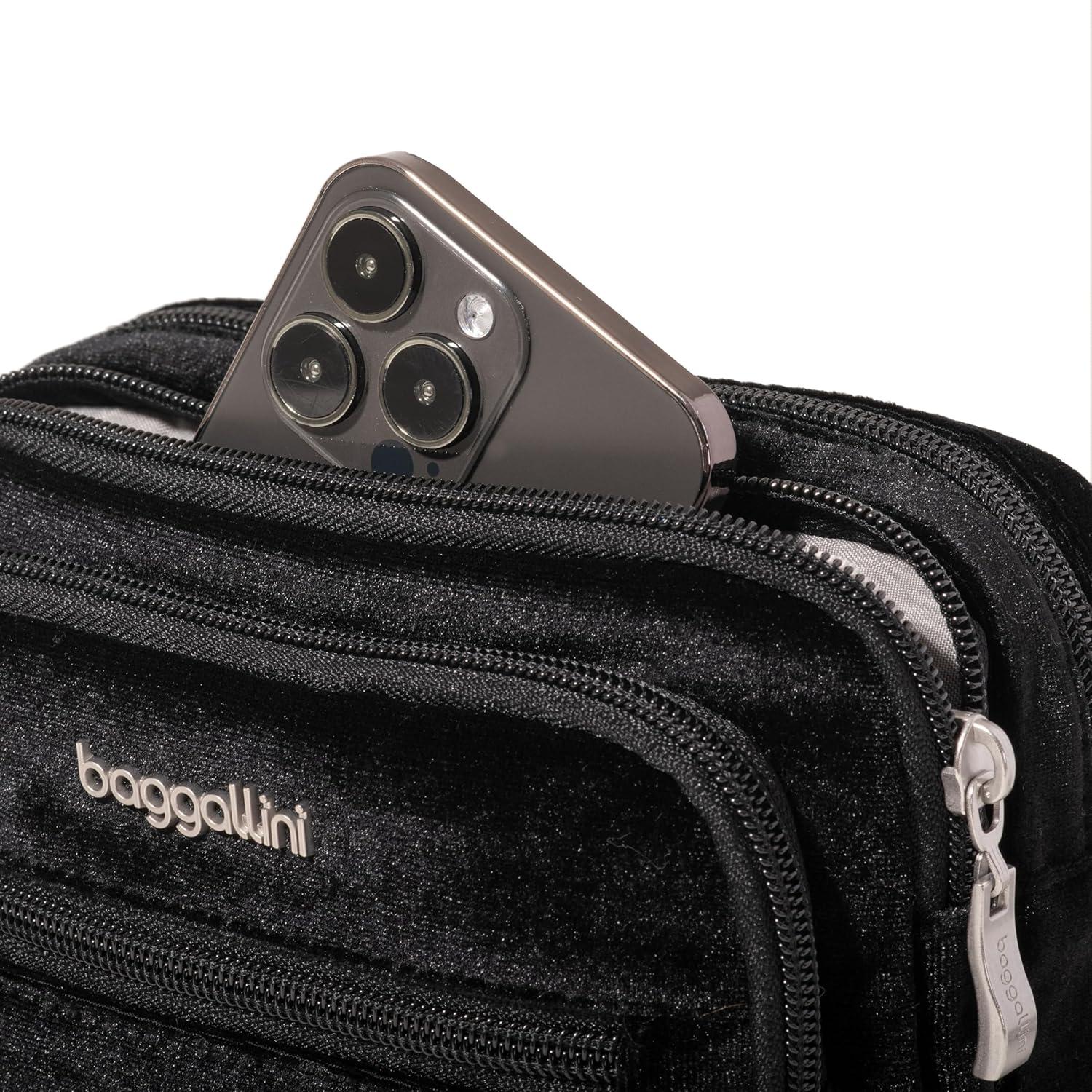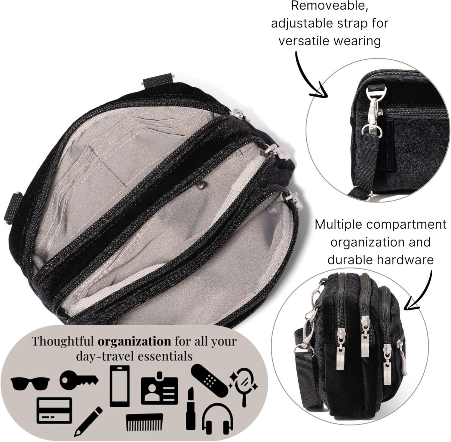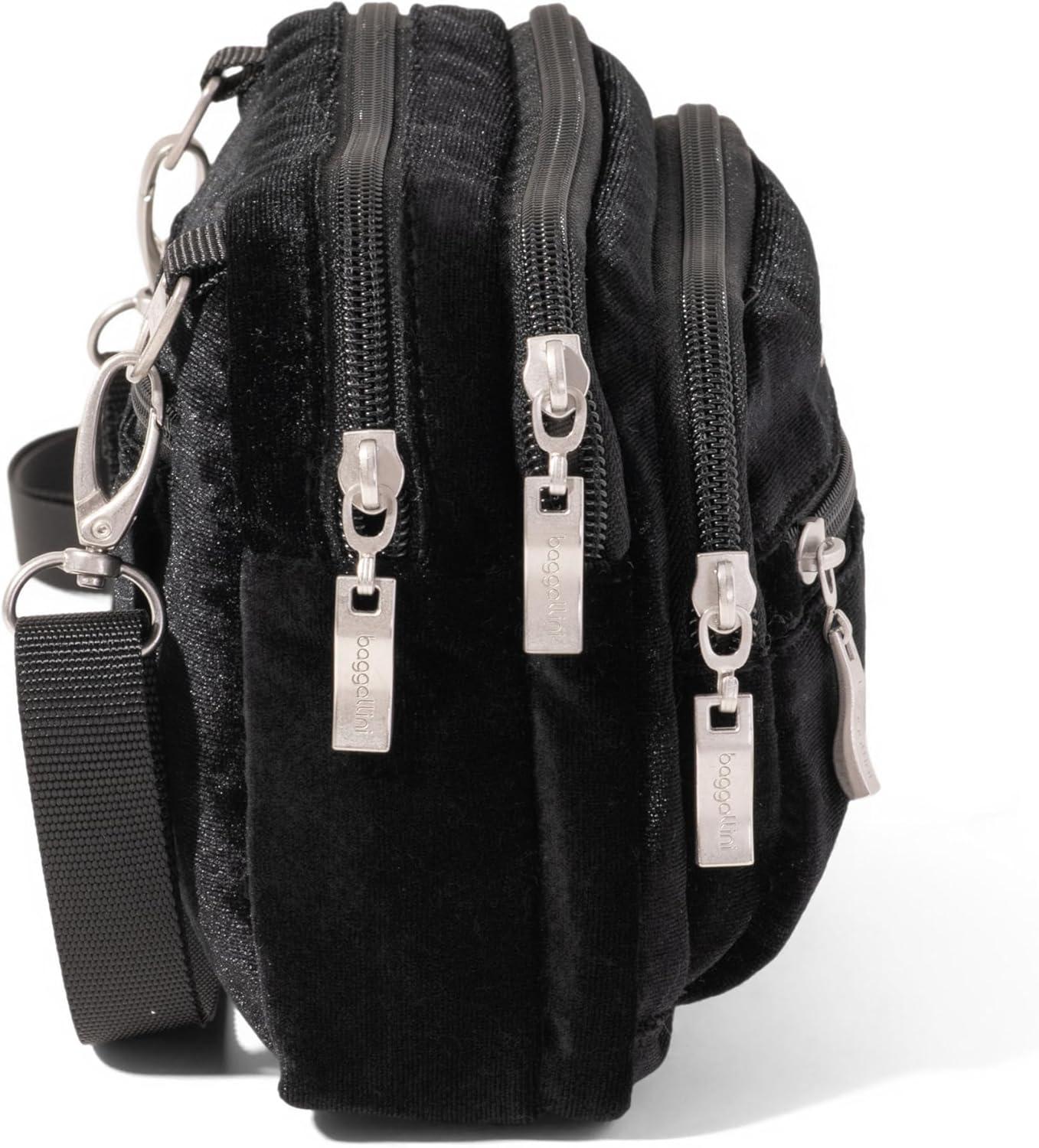 Baggallini Triple Zip Small Crossbody Bag for Women – 8×6 Lightweight Convertible Fanny Pack Belt Bag(Black Velvet)