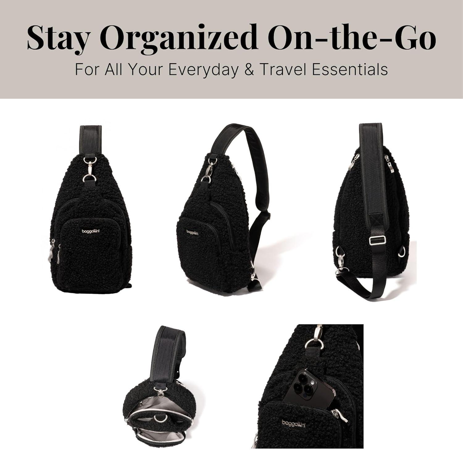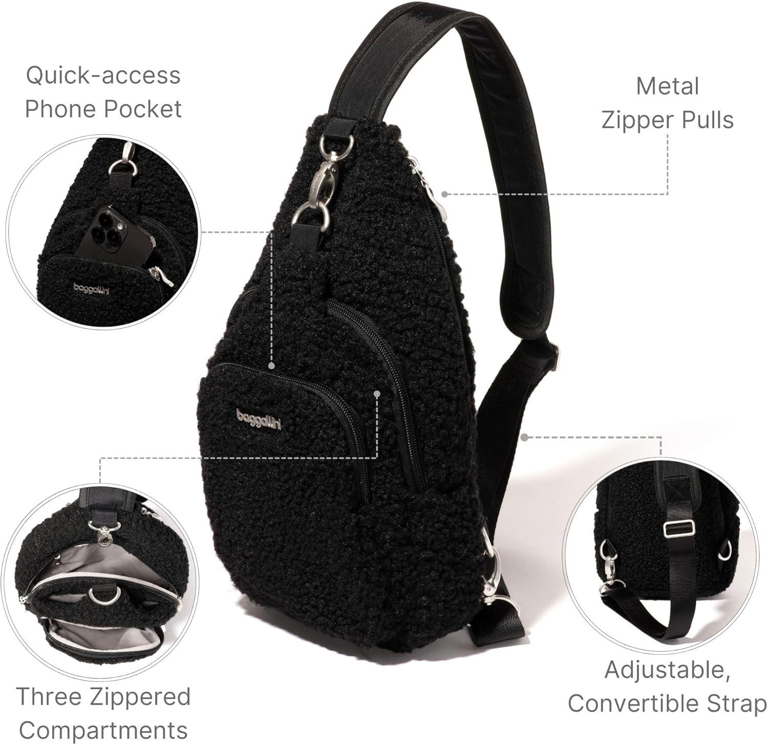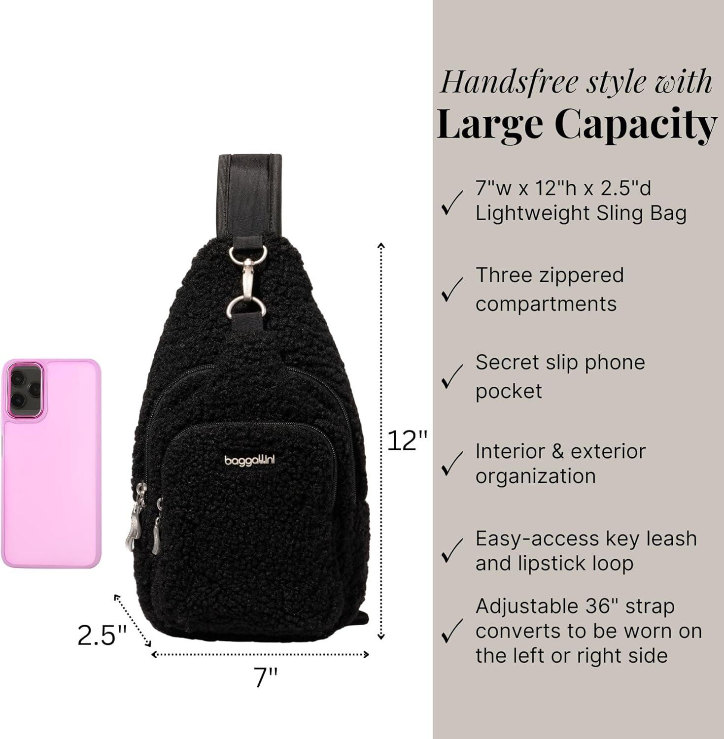 Baggallini Women’s Central Park Sling 12″x7″ Crossbody Bag W/Convertible Adjustable Shoulder Strap(Black Faux Shearling)