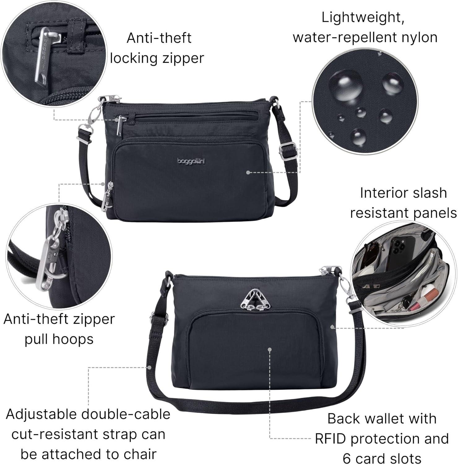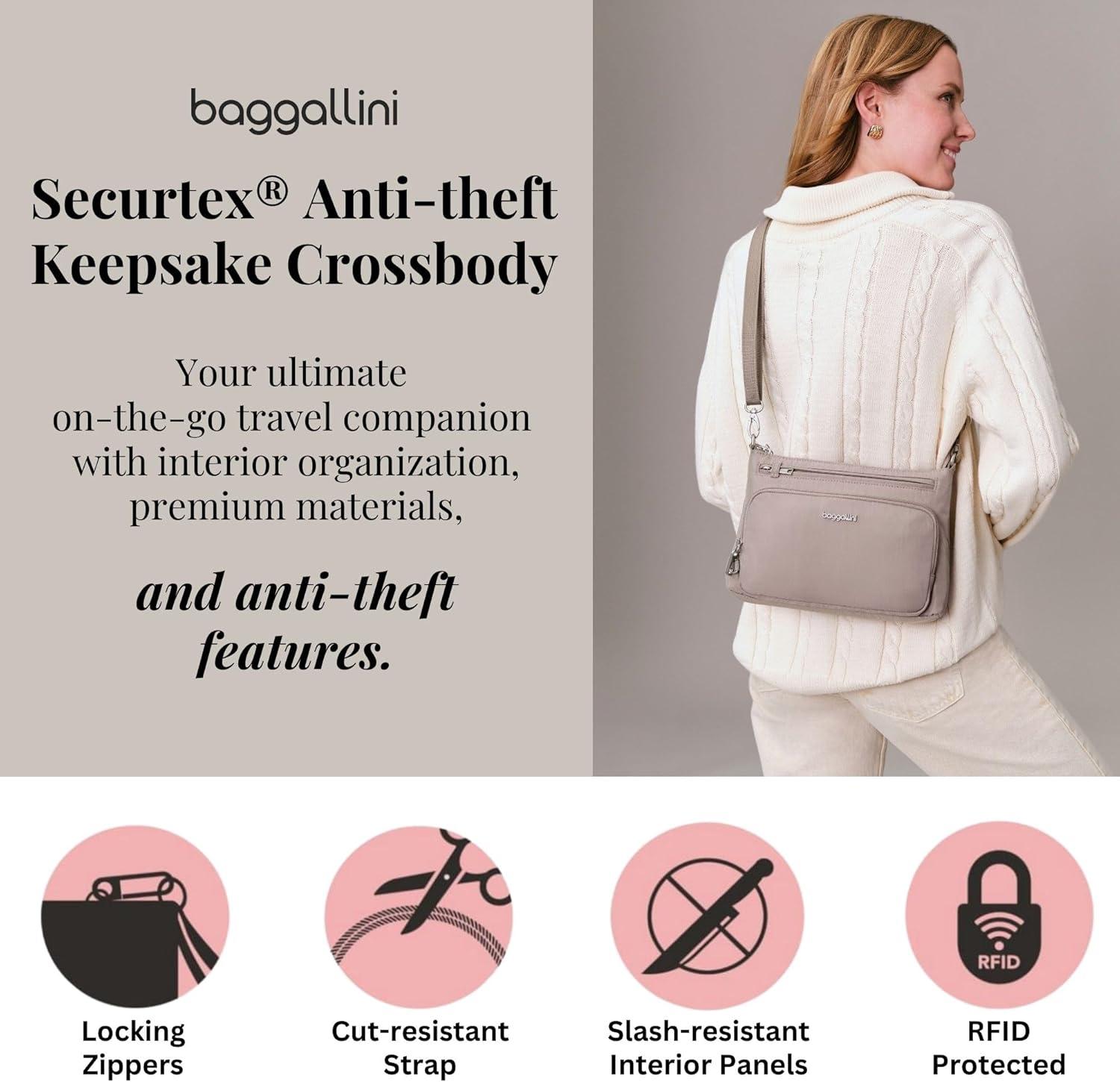 Compact yet confident, the Securtex® Anti-Theft Keepsake Crossbody is designed to keep your essentials close—and protected. With locking zippers, cut-resistant material, and an RFID-protected front pocket, it brings peace of mind in a sleek, streamlined silhouette. Lightweight and secure, it’s the crossbody that’s ready for every adventure, big or small. Travel securely and stylishly with this women’s anti-theft crossbody bag, built for peace of mind wherever your day takes you. Designed from lightweight, water-repellent material with interior slash-resistant panels, it provides durable protection against both the elements and opportunistic theft. The cut-resistant crossbody strap adjusts for comfort and can be attached to a post or chair, helping deter grab-and-go theft in busy cafés or crowded spaces. Locking zippers secure your belongings, making this the ideal anti-theft travel purse for city adventures, vacations, or daily commutes. A built-in RFID-protected back wallet with six card slots helps block electronic pickpocketing, keeping your personal information safe. The privacy pocket, key leash, and lipstick loop add thoughtful organization, while the slim profile keeps your essentials close and easy to reach. With compact dimensions of 9.8” W x 7” H x 1.9” D and a 3.4 L capacity, this lightweight RFID crossbody bag offers room for your phone, passport, and travel must-haves without adding bulk. Whether you’re exploring a new city, boarding a flight, or running daily errands, this slash-resistant crossbody handbag delivers the perfect blend of security, style, and practicality—your trusted companion for every journey.